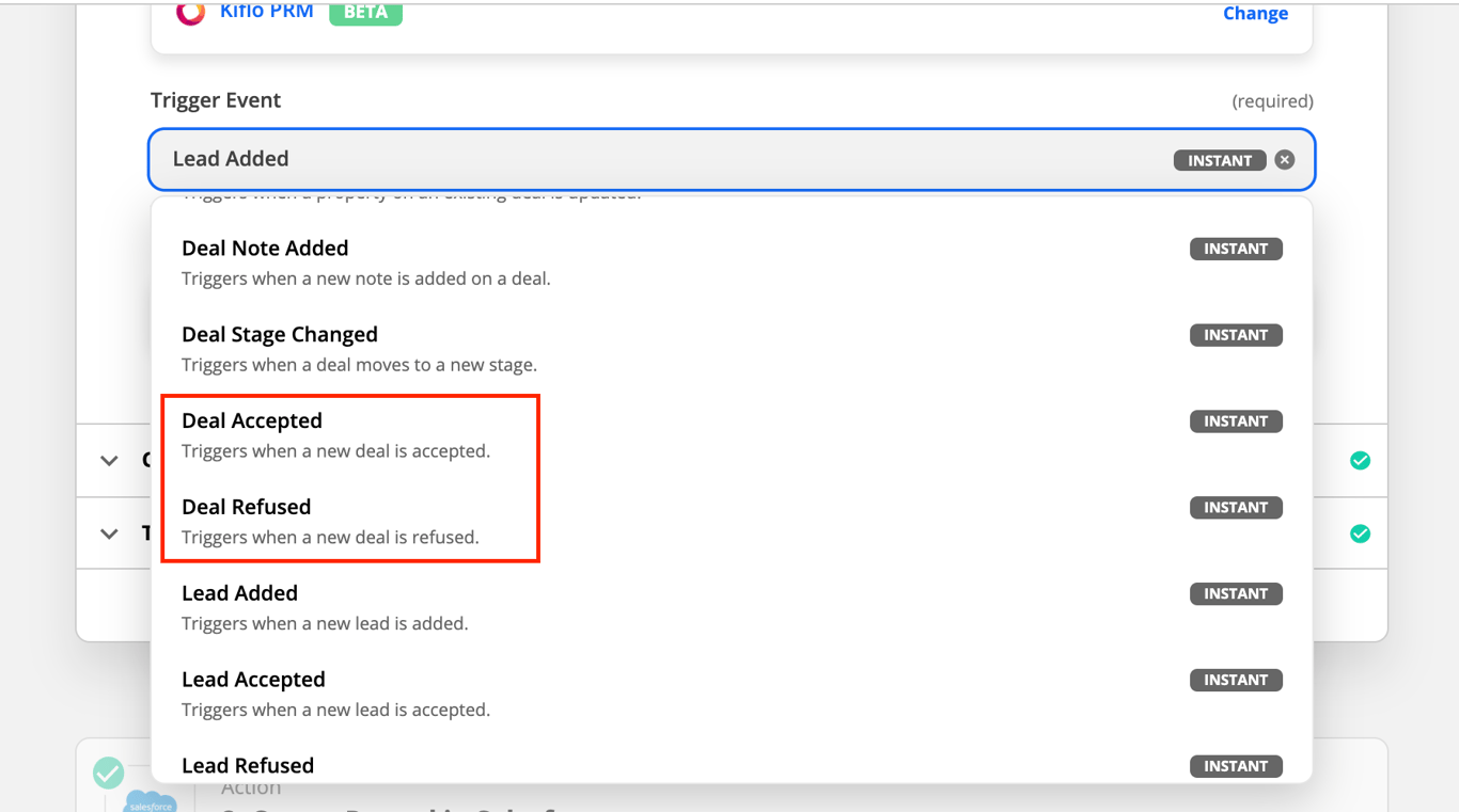 We have added a new trigger in Zapier that allows you to use deal accepted and deal refused as a trigger.