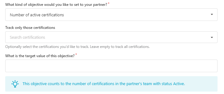 Keep track of certifications acquired by partners with the new business plan objective: Number of active certifications